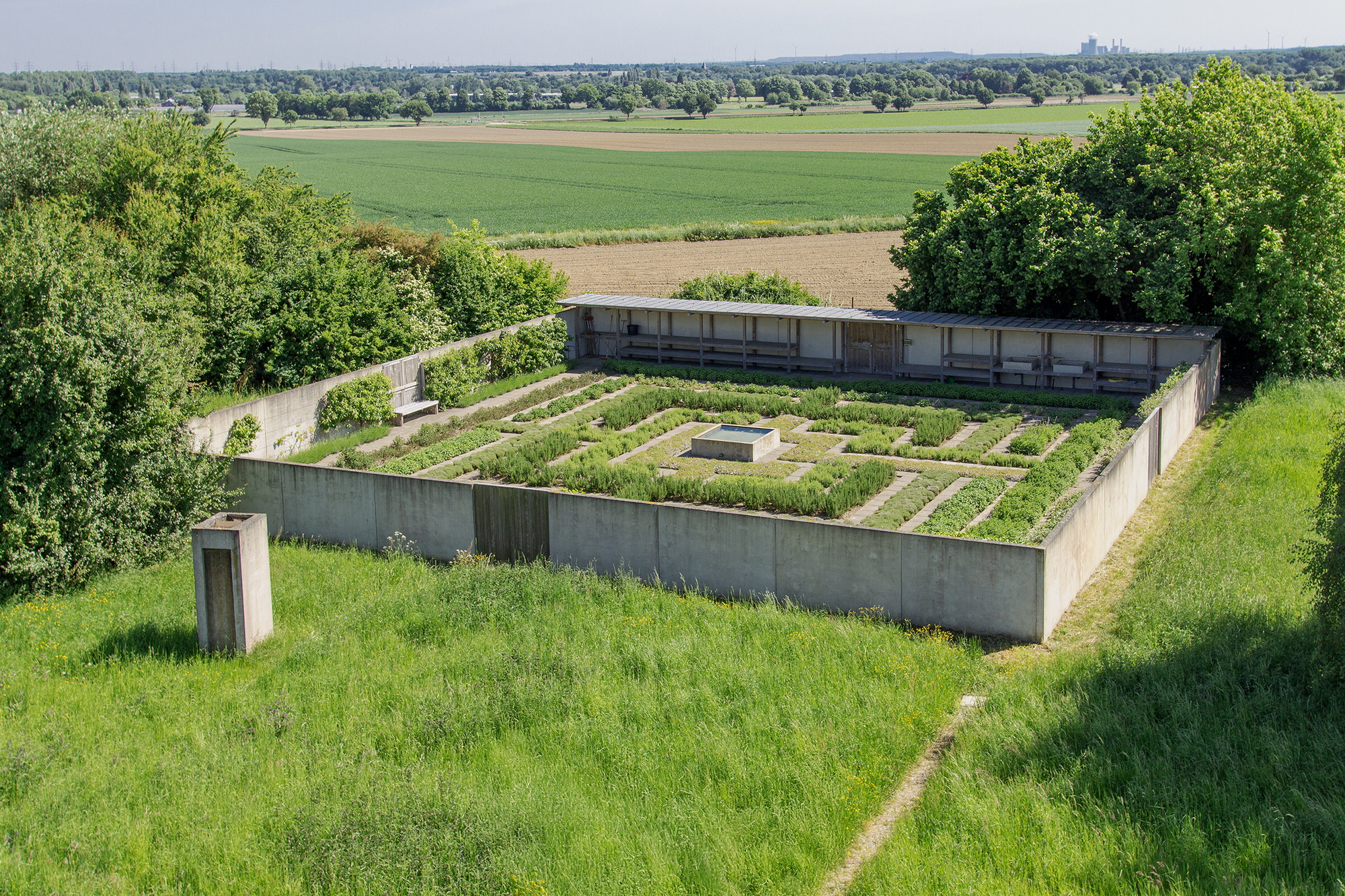 Das von hohen Betonmauern umschlossene quadratische Areal ist von Westen her zu betreten. In seinem Zentrum befindet sich ein ebenfalls quadratisches, mit Wasser gefülltes Betonbecken. Der einzige Weg führt zwischen Beeten als Betonband parallel zu den Außenmauern ohne Abzweigung in die Mitte, aber nicht direkt, sondern in der pendelnden, sich dem Zentrum nähernden und wieder entfernenden Bewegungsfigur des Labyrinths durch alle vier Quadranten. Auf solch maximalem Umweg ins Ziel gelangt, gibt es nur die Umkehr, um wieder hinauszukommen.
